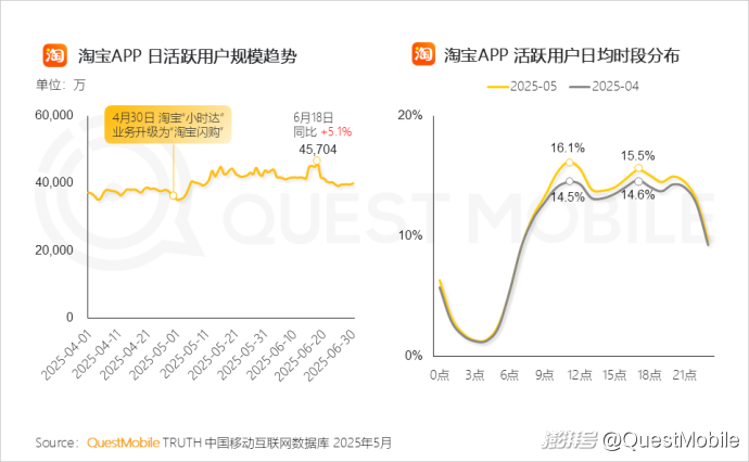 淘宝在闪购业务及618大促推动下,日活跃用户规模提升明显,QuestMobile数据显示,2025年6月18日,淘宝APP日活用户规模达4.57亿,同比增长5.1%,在“淘宝闪购”业务上线的次月,淘宝APP用户在11点-12点、17点-18点点餐高峰时段活跃提升明显,分别提升1.6%和0.9%。