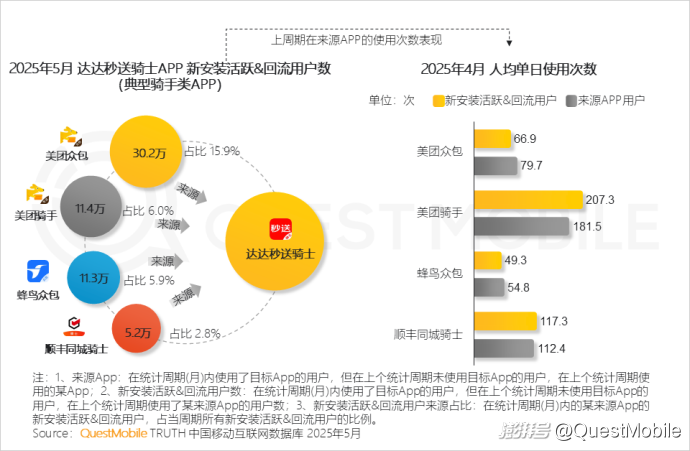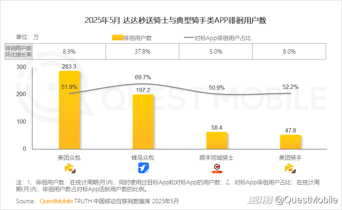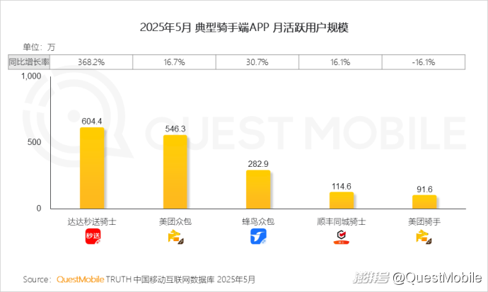 QuestMobile数据显示,截止2025年5月,京东旗下的达达秒送骑士APP月活跃用户规模超600万,同比提升368%,领跑骑手端应用市场,美团众包、蜂鸟众包APP月活跃用户规模分别达到546.3万和282.9万,增速也均实现两位数增长,分别为16.7%、30.7%。