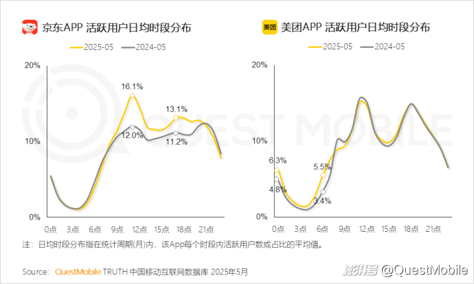 QuestMobile数据显示,截止2025年5月,京东APP11点-12点午间点餐高峰时段、18点-19点的晚间点餐高峰时段活跃用户比例提升显著,分别提升4.1%和1.9%;美团APP在夜间零点时段及早间6点-7点时段活跃比例提升明显,分别提升1.5%和2.1%。