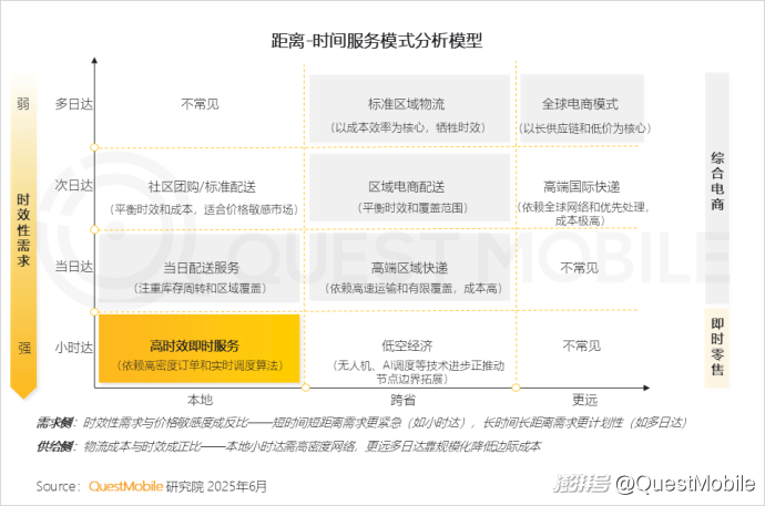 1、距离和交付时间共同决定了商业模式的可行性、需求特征和供给结构;短距离和短交付时间要求高时效性和本地化运营,而长距离和长交付时间则更注重成本效率和规模化
