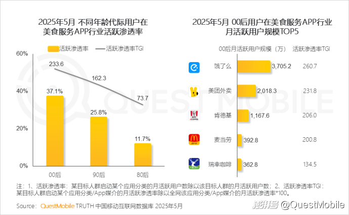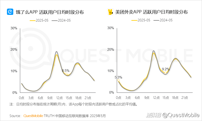 QuestMobile数据显示,截止2025年5月,饿了么APP14点-15点及15点-16点非正餐时段活跃用户比例均提升0.3%,美团外卖APP在相应时间段均提升0.7%。