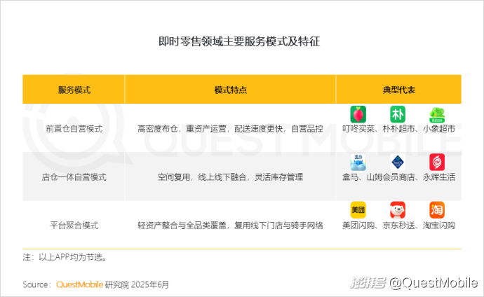 6、当前即时零售领域已形成“前置仓自营”、“店仓一体自营”及“平台聚合”三大服务模式,分别通过极速配送、灵活服务和资源整合等运营策略满足用户的即时需求