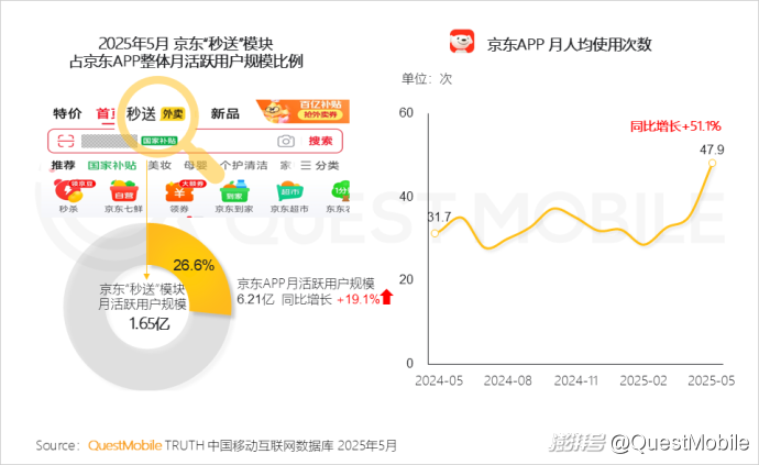 QuestMobile数据显示,截止2025年5月,京东“秒送”模块月活跃用户规模已达1.65亿,占京东APP整体流量的26.6%,京东APP用户月人均使用次数已达47.9次,同比提升51.1%。