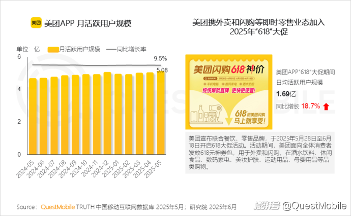 5、美团在稳固餐饮外卖市场的基础上,通过闪购业务扩展至生活消费品领域,并借助618大促契机实现流量增长QuestMobile数据显示,美团在2025年618大促期间,日均活跃用户规模达1.69亿,同比增长18.7%。