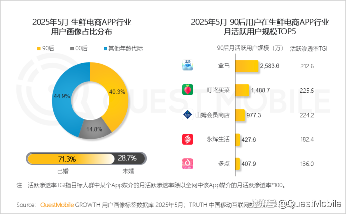 QuestMobile数据显示,生鲜电商APP行业90后、00后用户合计占比超55%,且多为已婚家庭用户,家庭日常生活生鲜采购需求旺盛,对叮咚买菜、山姆会员商店、盒马等APP偏好突出。