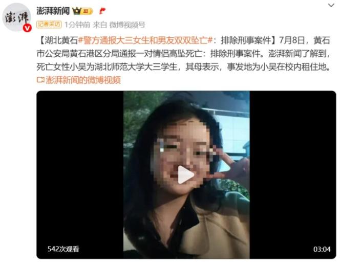 另据澎湃新闻报道,7月8日,黄石市公安局黄石港区分局通报一对情侣高坠死亡:排除刑事案件。澎湃新闻了解到,死亡女性小吴为湖北师范大学大三学生,其母表示,事发地为小吴在校内租住地。