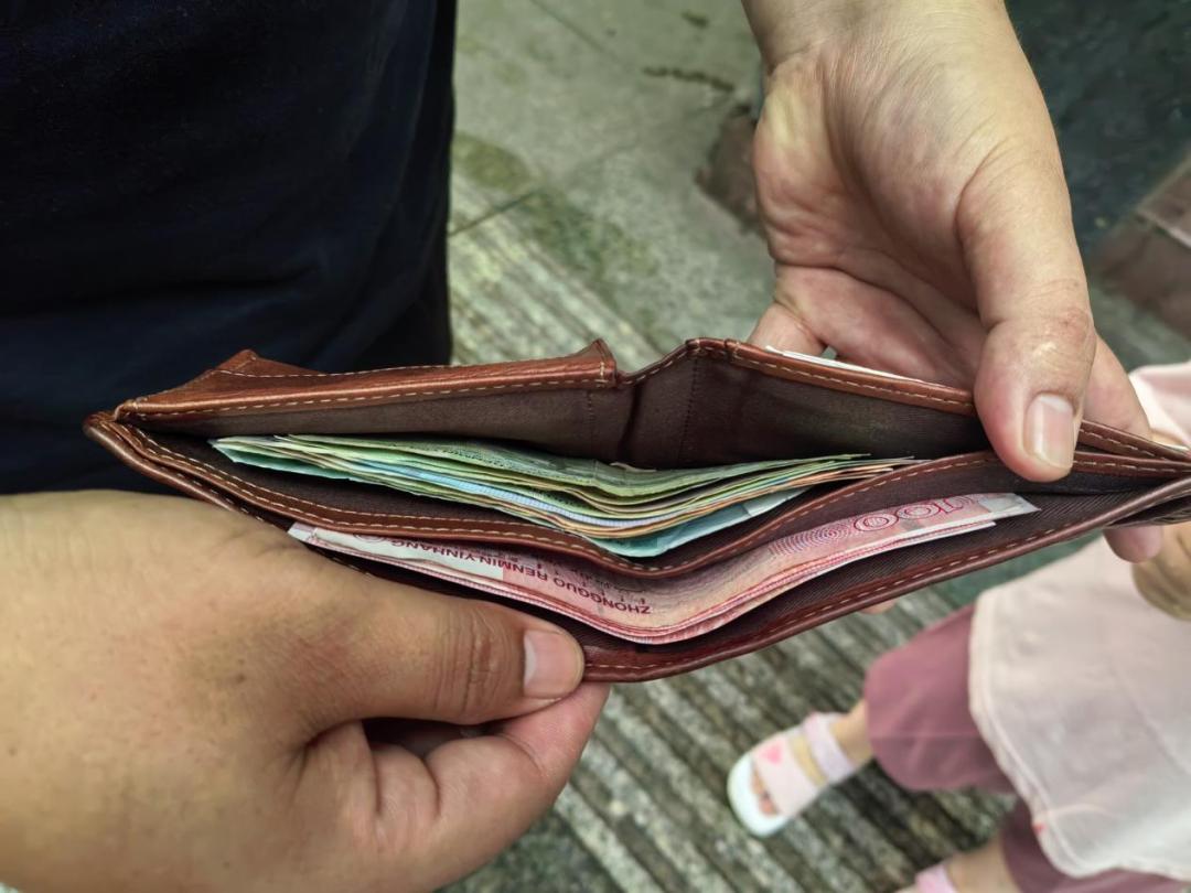 行至人行道转角,一个棕色的钱包静静躺在路边。刘浩拾起查看,里面整齐码放着身份证、银行卡,还有超市购物卡和几张重要票据及现金若干。