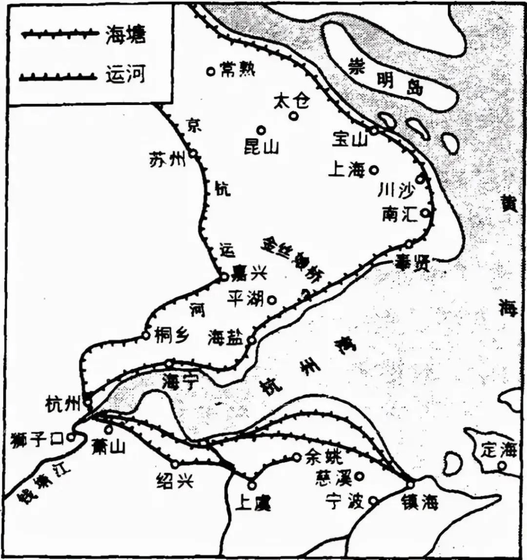 古代江浙海塘分布图和内陆的江河堤防不同
