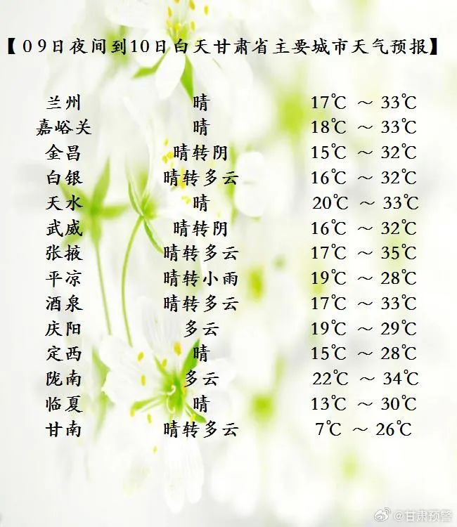 今天夜间到明天白天(7月9日20时-7月10日20时),甘南、陇南、天水、平凉、庆阳等州市多云,部分地方阴有阵雨;省内其余地方多云或晴,祁连山区阴有小雨或阵雨。