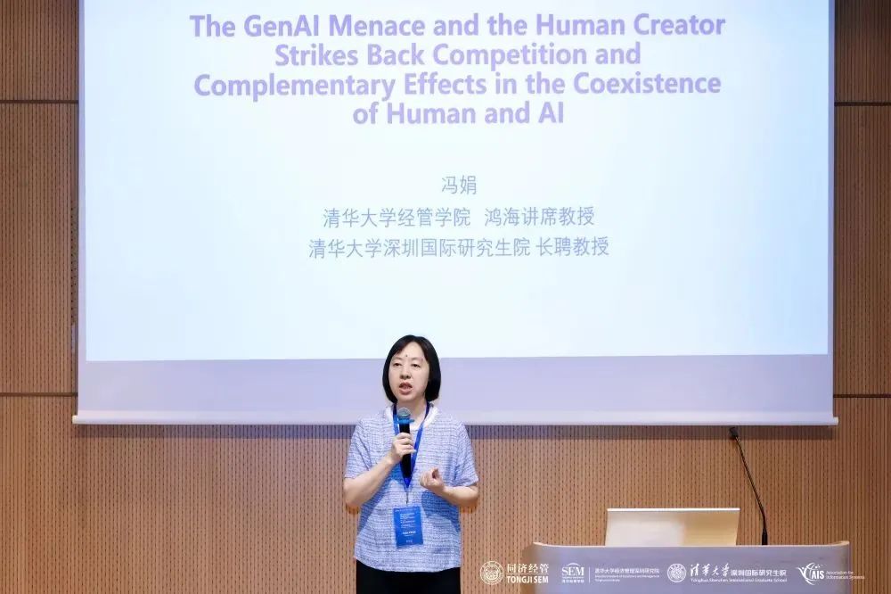 冯娟教授主旨演讲题为“生成式人工智能的威胁与人类创造者的反击:人类与人工智能共存的竞争与互补效应”(“The GenAI Menace and the Human Creator Strikes Back: Competition and Complementary Effects in the Coexistence of Human and AI”),探讨了在生成式人工智能广泛应用下,不同质量层次的人类创作者应通过“毒化数据”(Data poisoning)抵御AI学习、积极利用AI提升自我,还是保持观望,及其对创作者市场地位、竞争策略与共存前景的模型化分析。