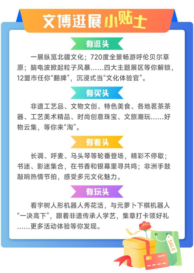 非遗兴安 艺润北疆如果说自然兴安让您身临其境、流连忘返,那么人文兴安一定会让您对这片土地爱得深沉。10余类500多件兴安盟特色文创产品将悉数亮相,精彩绝伦的民族风情表演将轮番上演,浓郁的北疆文化体验轻松“拿捏”。