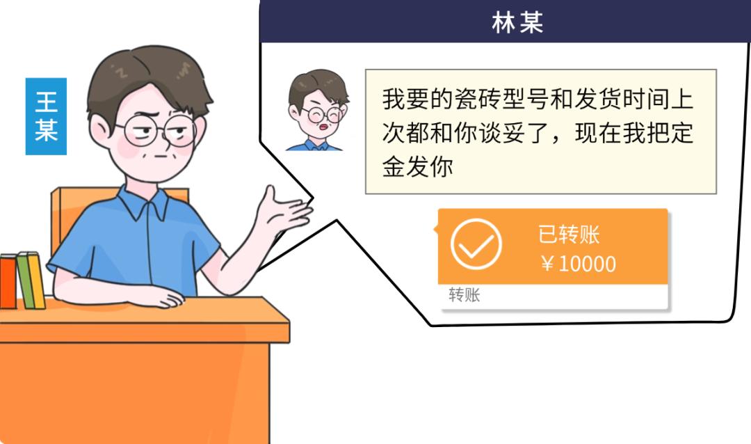 2023年8月,王某在微信上向林某订购了价值14000元的瓷砖,并谈妥了瓷砖的具体型号、发货时间、交付方式等,王某当即向林某支付了10000元定金。