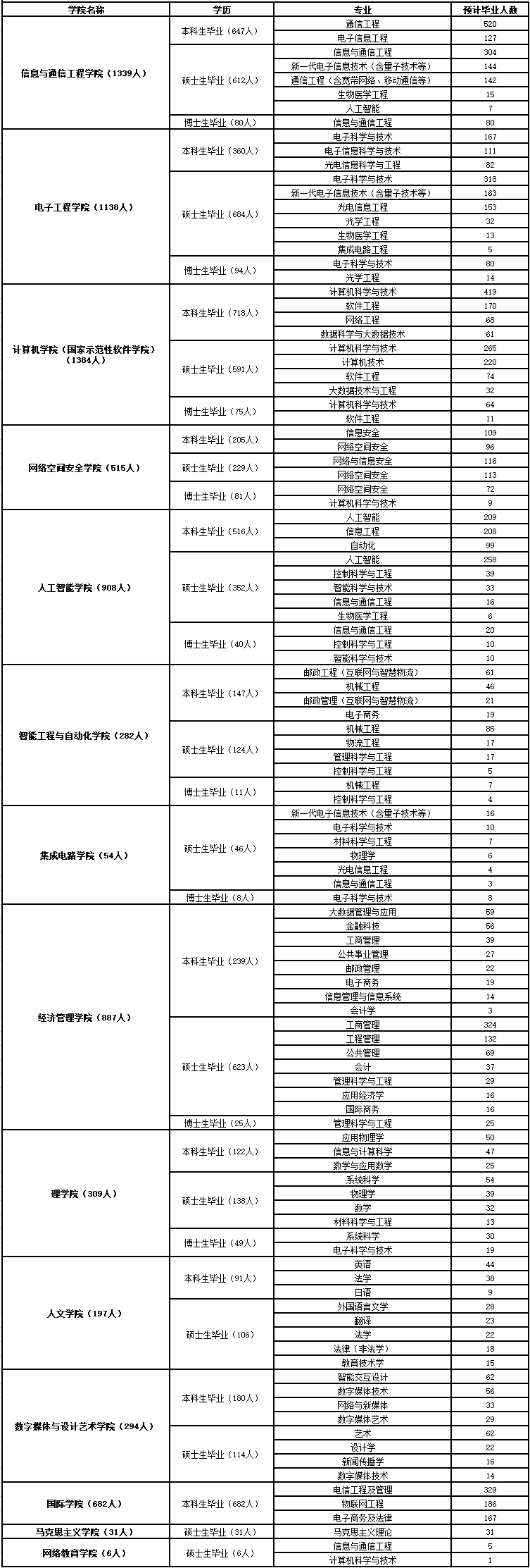 学校每年有7200余名毕业生,分布在信息与通信工程学院、电子工程学院、计算机学院(国家示范性软件学院)、网络空间安全学院、人工智能学院、智能工程与自动化学院、集成电路学院、经济管理学院、理学院、人文学院、数字媒体与设计艺术学院、马克思主义学院、国际学院、网络教育学院等学院。