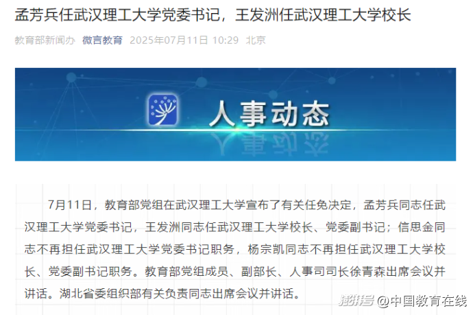 7月11日,教育部党组在武汉理工大学宣布了有关任免决定,孟芳兵同志任武汉理工大学党委书记,王发洲同志任武汉理工大学校长、党委副书记;信思金同志不再担任武汉理工大学党委书记职务,杨宗凯同志不再担任武汉理工大学校长、党委副书记职务。教育部党组成员、副部长、人事司司长徐青森出席会议并讲话。湖北省委组织部有关负责同志出席会议并讲话。