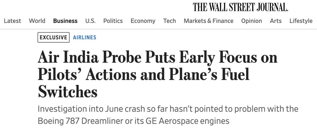据《华尔街日报》报道,熟悉美国官员初步评估的知情人士透露,对上月印度航空坠机事件的调查目前集中在飞行员操作上,且尚未发现波音787梦想客机本身存在问题。