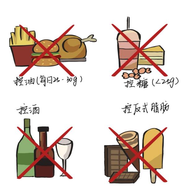 控油(每日25—30g)、控盐(<5g)、控糖(<25g)、控酒、控反式脂肪。