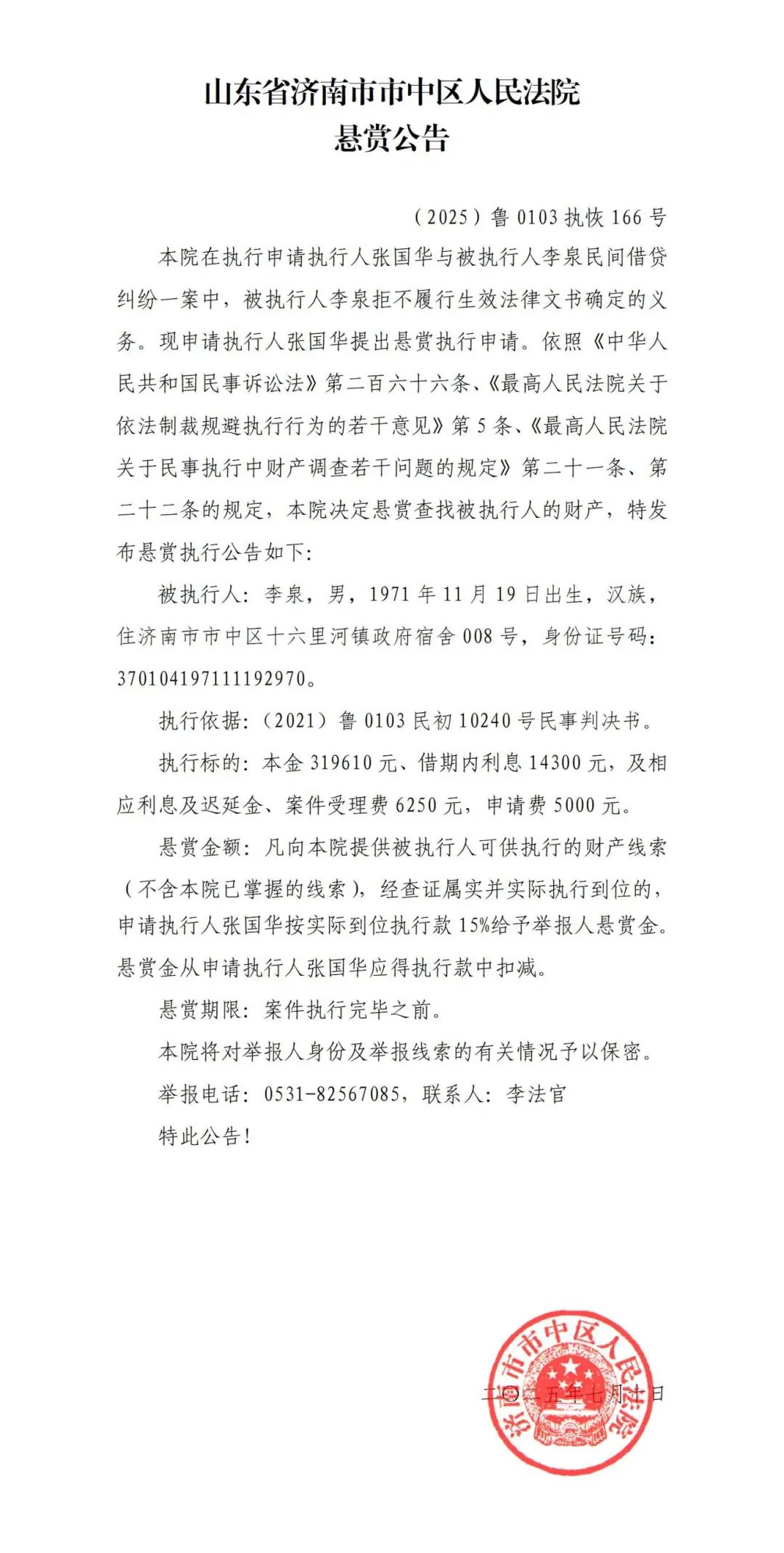 济南市中法院向上滑动看下一个原标题:《济南市市中区人民法院悬赏公告!》