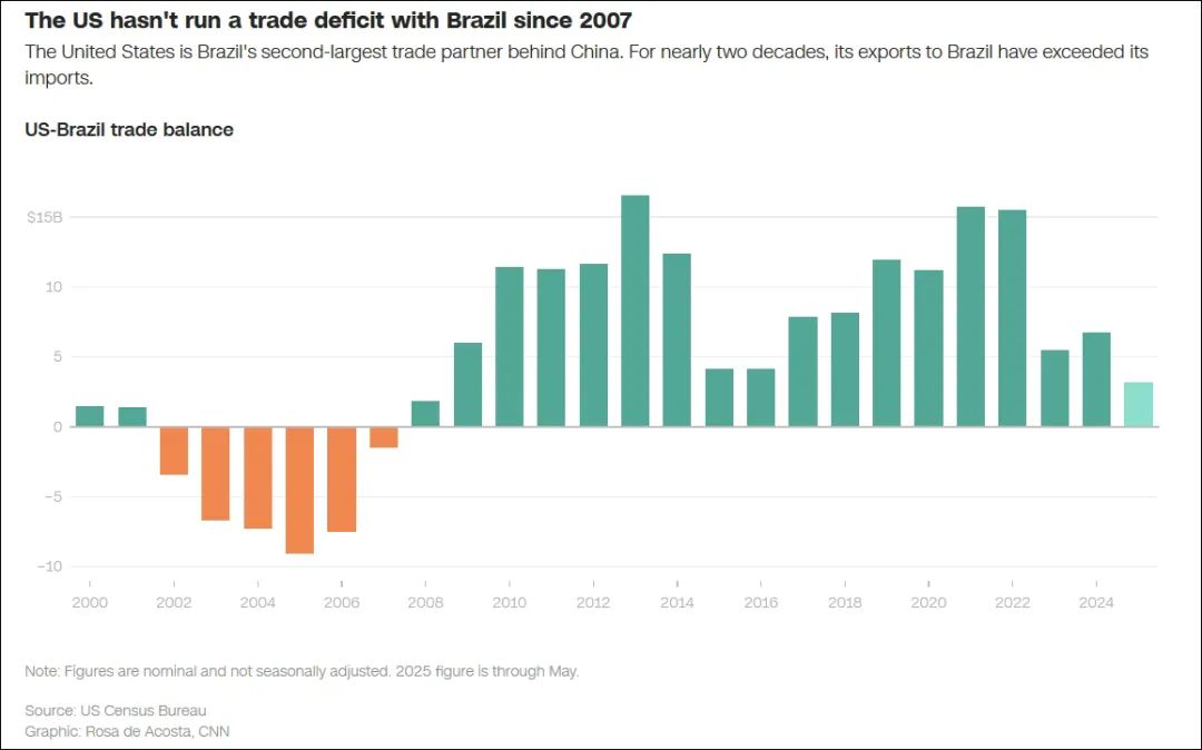 与本周收到类似公开信的其他国家不同,美国过去18年一直对巴西保持贸易顺差。仅2024年,美国在商品贸易上对巴西的顺差就达到约70亿美元。若计算商品与服务总额,顺差高达286亿美元。也正因如此,特朗普4月最初宣布关税措施时,并未给巴西设定所谓的“对等关税”,征收的是10%“基准税率”。