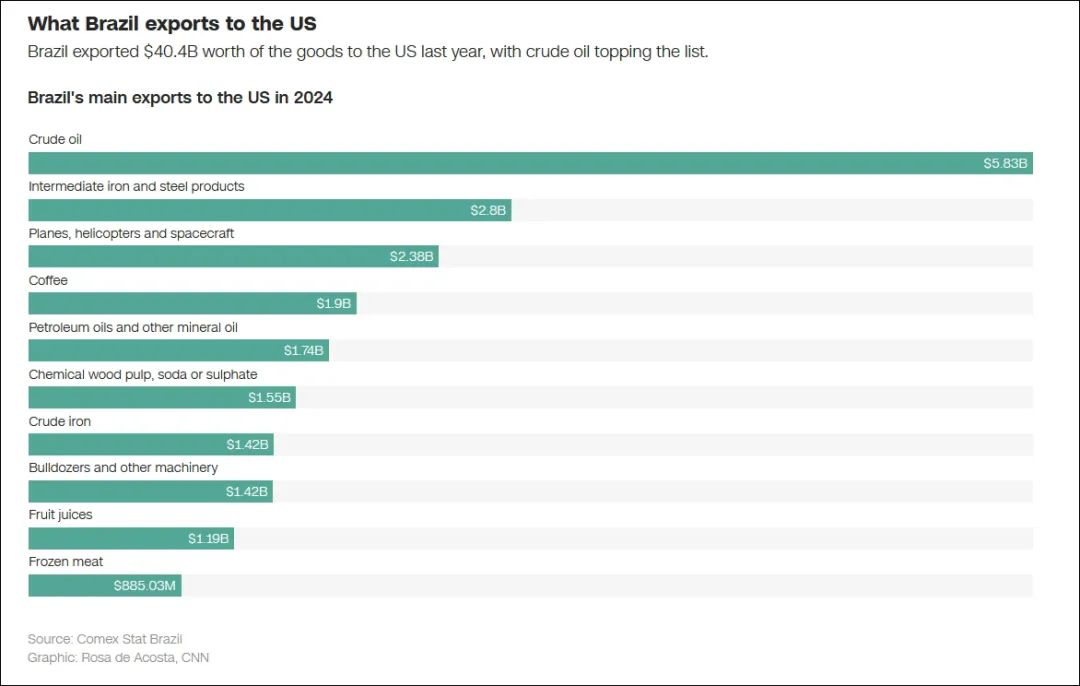 2024年,巴西主要出口到美国的商品包括原油,钢铁中间产品,钢铁、直升机和航天器,以及咖啡等 CNN英国巴克莱银行的一份报告指出,从特朗普此次对巴西的关税威胁来看,即使各国在8月1日前与美国达成贸易协议,仍可能在此之后面临进一步的关税升级。报告认为,这“很可能会削弱亚洲新兴国家政策制定者的信心”,即使与美国达成协议,贸易政策不确定性也未必能消除。
