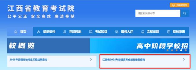 (登录江西省教育考试院网站首页,点击“江西省2025年普通高考成绩及录取查询”进入查询页面)