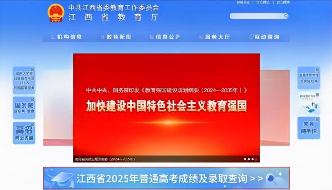 (登录江西省教育厅网站首页,点击“江西省2025年普通高考成绩及录取查询”进入查询页面)同时,也可进入“江西省教育考试院”官方微信首页下方菜单【录取查询】中“高招录取查询”栏目或“江西省教育厅”官方微信首页下方菜单【网上服务】中“高招录取查询”栏目进入查询渠道。
