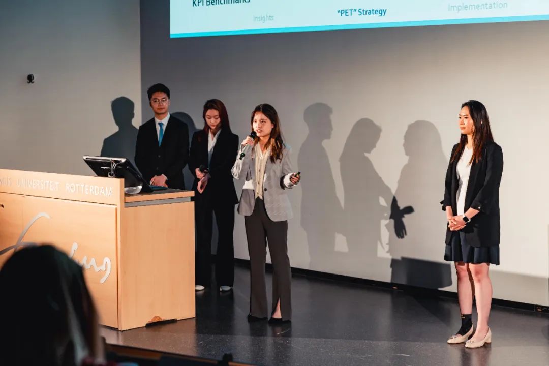 荷兰鹿特丹管理学院案例分析比赛挑战者轮的展示环节(徐秭榆为左三)徐秭榆将大学生参与商赛的策略归结为两条路径:若为能够快速上手、取得心仪的成绩,与其一开始就去一些竞争激烈的知名赛事厮杀,不妨先瞄准那些由知名企业主办但尚处初期、竞争相对较小的“小而美”赛事,更易脱颖而出,在提升自身经验和自信的同时也能为简历增色;若为更深度的能力提升,则要重点锤炼时间管理、团队协作的核心能力,特别是在面临“想法丰富而时间紧迫”的冲突时,需要迅速聚焦核心问题,实现最大的效益。“商赛没有标准答案,”她点明关键,“但能否精准捕捉评委预期、扎实高效地呈现方案,才是真正的决胜点。”