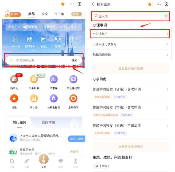 上“随申办市民云”APP,首页搜索关键词“出入境”,点击进入“出入境专栏”服务。