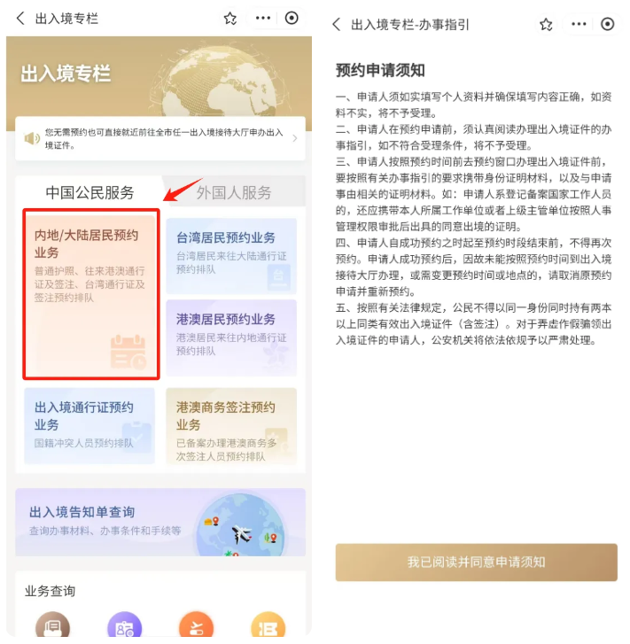 2、以“内地/大陆居民预约业务”为例,在“中国公民服务”栏目下找到预约入口,仔细阅读申请须知后进行办理。