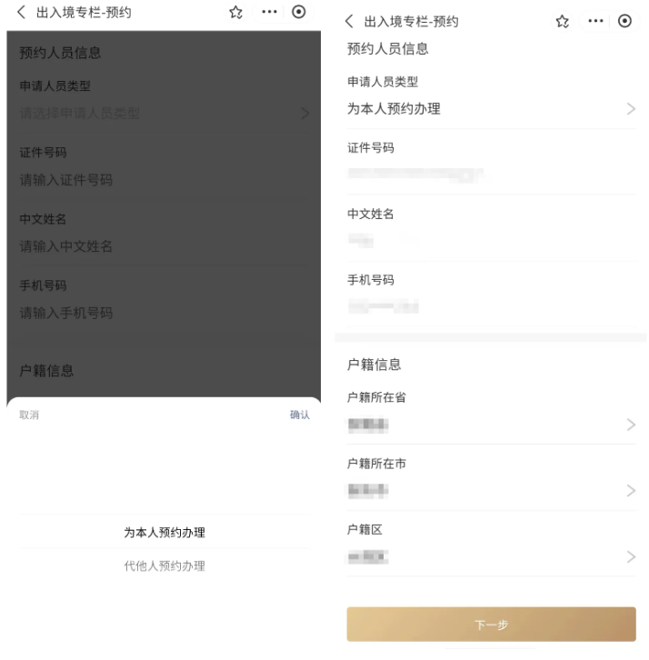 本人预约办理:系统自动获取申请人基本信息;代他人预约办理:需手动填写申请人身份证号、姓名、手机号码等信息。