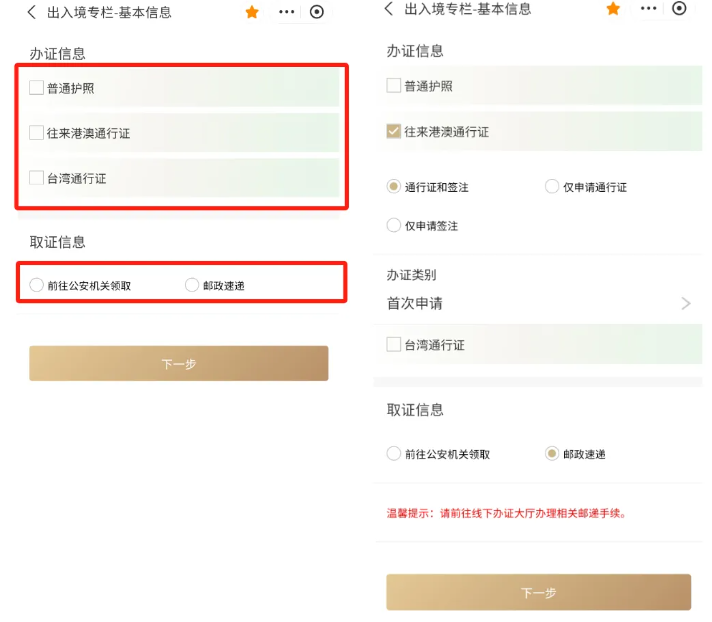 6、勾选计划办理的证件类型,并选择相应的办证信息及取证信息。