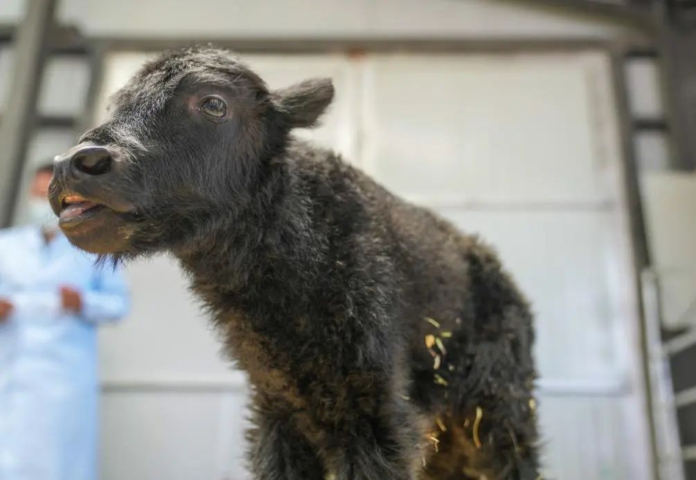 这是7月11日拍摄的在西藏(当雄)金丝野牦牛繁育基地剖腹诞生的第一头克隆牦牛。新华社记者 晋美多吉 摄浙江大学国家濒危野生动植物种质基因保护中心主任方盛国教授说:“西藏是牦牛的主要生活区域,数量较大。开展牦牛克隆工作,不仅有助于西藏构建牦牛繁育体系,还可以精准复制繁育能力强、肉产量高、抗病性强的牦牛个体,快速扩大优质种群,提升牦牛养殖的经济效益。”
