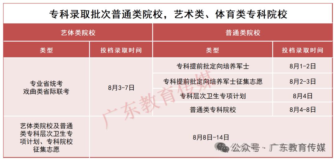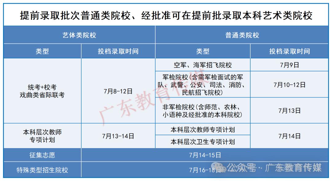 根据省教育考试院安排,广东省2025年高招录取工作于7月8日正式启动,至8月14日结束。其中,本科提前批为7月8日至18日,本科批为7月17日至31日,专科批为8月1日至8月14日。
