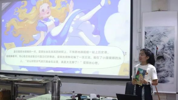 北京新学道临川学校的崔老师为孩子们沉浸式讲解了《爱丽丝梦游仙境》绘本的精彩片段:从掉进兔子洞的惊奇,到遇见疯帽子的趣事,再到与红心皇后的相遇……孩子们被跌宕起伏的情节和光怪陆离的角色深深吸引。老师绘声绘色的讲述,将大家带入了那个充满无限可能的奇幻国度。