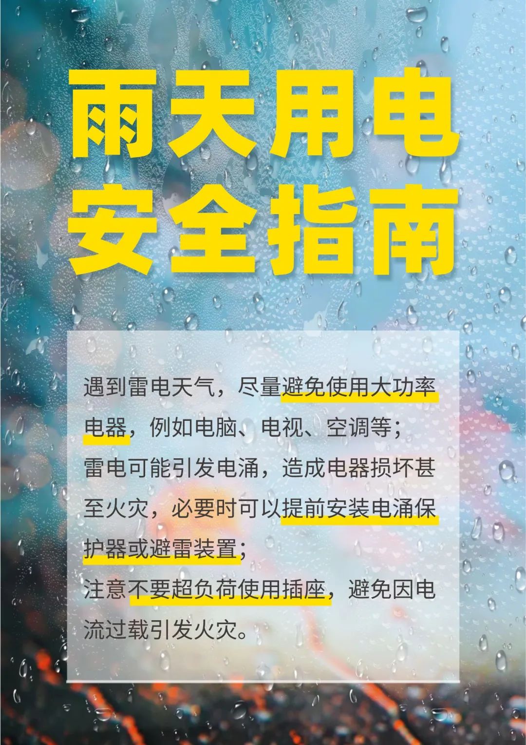 雨天空气潮湿,易发生电气火灾事故。如您在户外,请远离高压线、变电箱等电力设施;在室内时,关注电器情况。