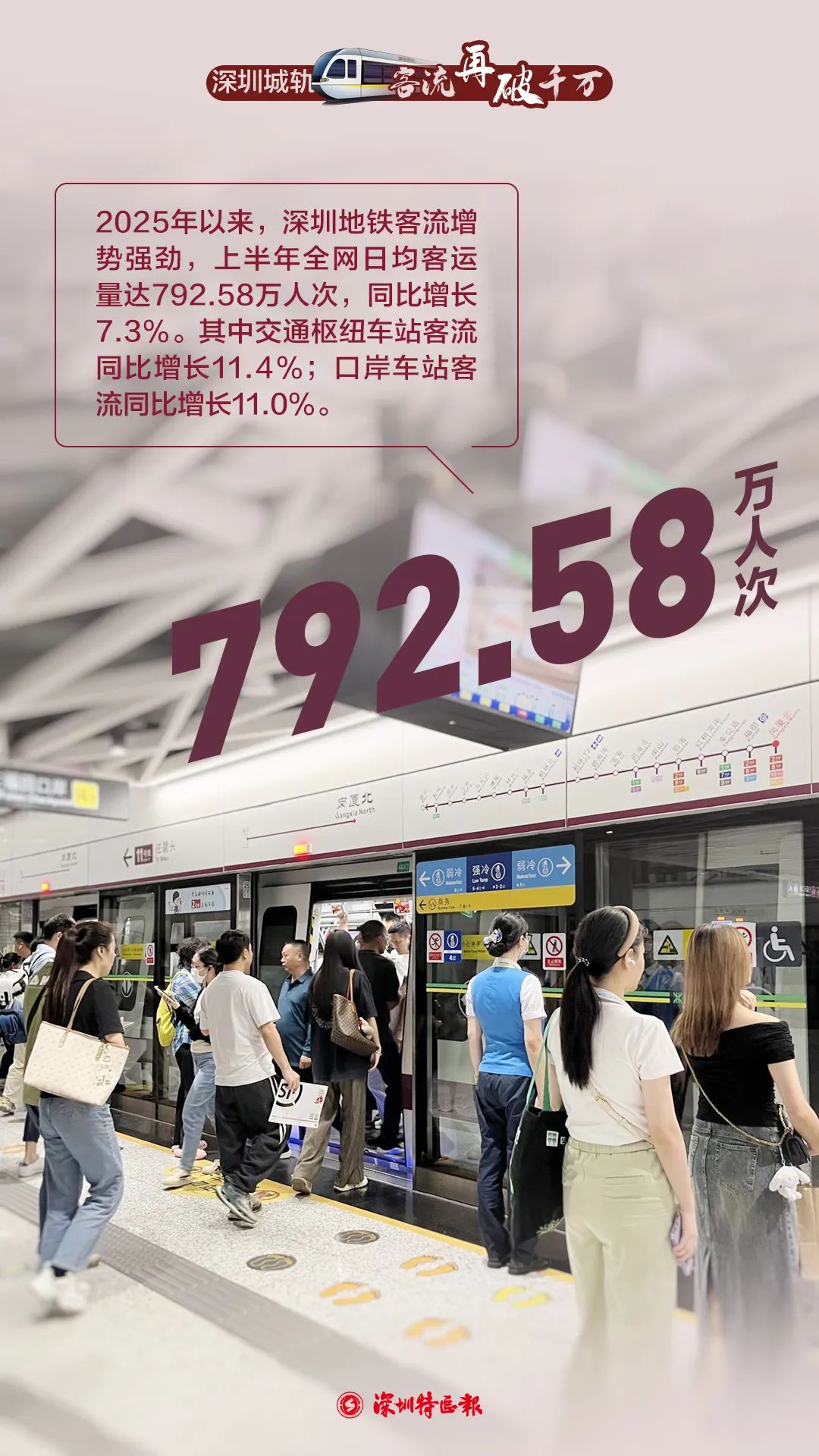 据了解,2025年以来,深圳地铁客流增势强劲,上半年全网日均客运量达792.58万人次,同比增长7.3%。其中交通枢纽车站客流同比增长11.4%,日均客运量180.35万人次,凸显城市各区域人员往来流动频密,经济交往活跃。深圳地铁三大热门枢纽车站岗厦北、布吉、深圳北,日均客运量分别为34.17、28.78、24.62万人次,同比分别增长15.5%、6.2%、9.2%。