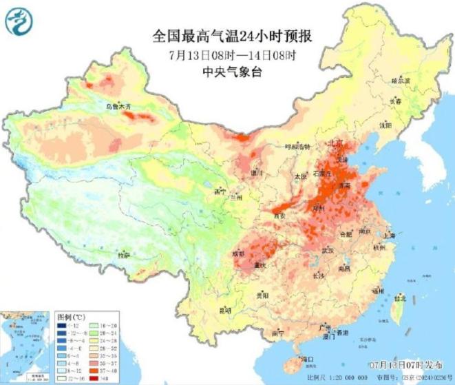 中央气象台7月13日6时继续发布高温黄色预警:预计7月13日白天,新疆吐鲁番盆地、内蒙古西部、陕西中南部、山西南部、河北中南部和东北部、北京大部、天津、山东大部、河南、安徽北部、江苏北部、湖北大部、湖南北部、四川盆地东部、重庆大部等地有35~36℃高温天气,其中,河北中南部、天津大部、山东西部、河南中北部、安徽北部、湖北北部和西部、重庆东北部等地部分地区最高气温37~39℃,山东西部、河南东北部局地可达40℃以上。
