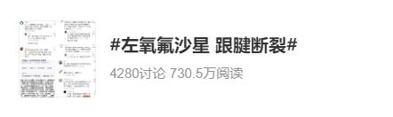 7月8日,一网友发帖称,今天刷到有网友在做跳舞的热身动作时,跟腱断了。评论区好几个网友留言:“你跳舞前用左氧氟沙星了吗?眼药水也算。”“左氧氟沙星的副作用就是跟腱断裂,使用期间要避免运动。”这个帖子引发网友持续讨论,也因此让“左氧氟沙星 跟腱断裂”的话题冲上7月9日微博热搜榜首位。