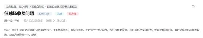 近日,拉萨市委针对网友在人民网“领导留言板”反映的体彩公园篮球场违规收费及照明设施不完善等问题,迅速展开调查并作出整改部署。目前,涉事企业已被责令停止收费,并按要求恢复球场免费开放,同时完善夜间照明管理。