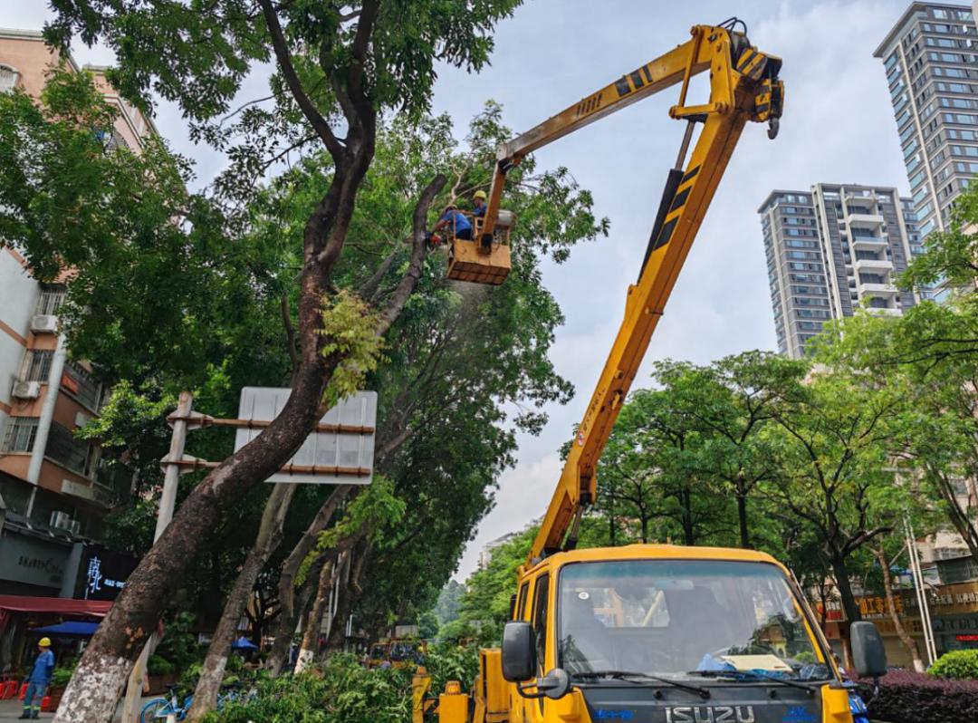 技术人员对跃进路的高大乔木进行修剪据了解,蓬江区城市管理和综合执法局自5月份开始已提前启动夏季绿化安全修剪专项行动,以应对台风天气带来的挑战,全力保障市民生命财产安全和城市正常运行。