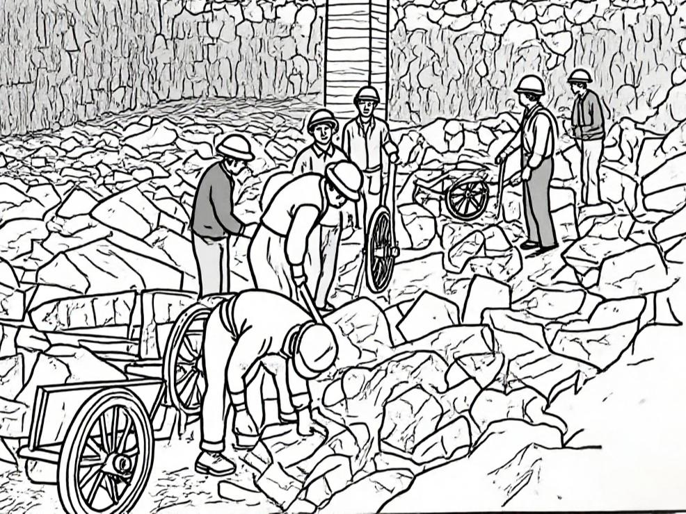 # 明矾开采——平硐新中国成立前,矾山大、小矿井多达四五十个,采石方式落后,矿石全靠人工肩挑背扛,劳动强度大且危险重重。新中国成立后,矿山迎来全面改造:1957年,西山平硐动工建设,铺设双向轨道,矿石运输实现矿车机械化。