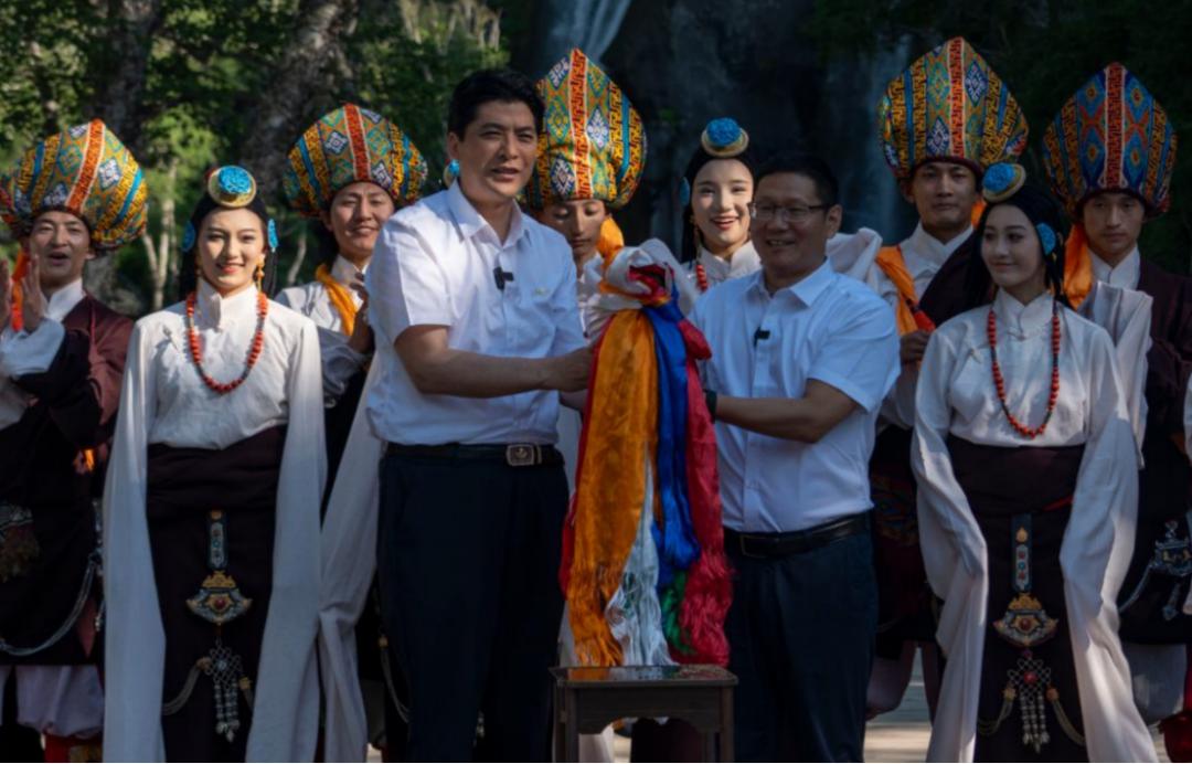 (图片来源:于峰)在绿渊潭举行的“两山结盟”仪式上,甘孜州文化和广播电视旅游局局长刘洪与长白山管委会旅游和文化体育局主要负责人,相继将来自贡嘎山的灵石、青稞、圣水和长白山的人参、松花砚、矿泉水共汇于宝瓶中,寓意两地山水相连、文化交融、情谊长存、共谋发展。