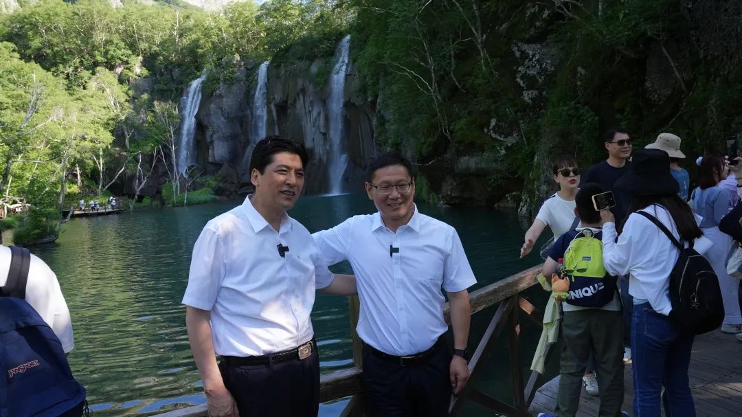 (图片来源:王继超)仪式后,刘洪一行实地考察了天池、瀑布、绿渊潭等景点。不同于甘孜冰川横亘的苍茫、草原铺展的辽阔,长白山有着林海叠翠的丰茂、温泉涌动的温润,处处透着关东大地独有的厚重与灵秀。两山虽一南一北、一寒一温,却各自以独有的天地造化惊艳世人,恰如两颗明珠在中华大地的文旅版图上交相辉映,可谓“各美其美,美美与共”。刘洪现场感叹,“大美长白山,此生必来!”,盛赞长白山文旅魅力。