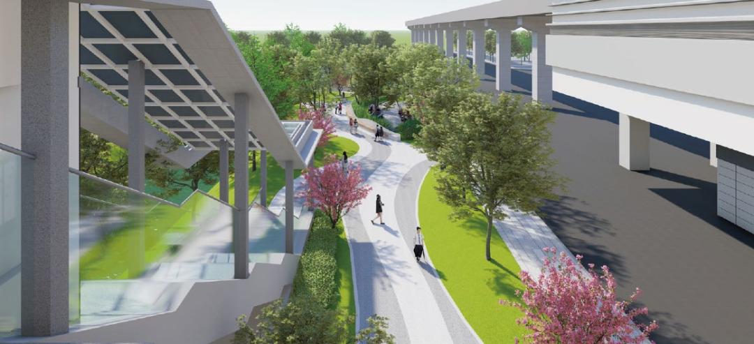 依河而建的这座公园,总面积约9950平方米,蕴藏着当涂的“人文诗意”。600米健步环道沿河蜿蜒,串联南侧大草坪、儿童活动场和北侧亲水平台。园内榉树亭亭玉立,寓意“一举成名”,各类桃花竞相绽放,暗合“桃李满天下”之意。既可陪孩子在草坪上奔跑,也可独坐亲水平台静赏流水潺潺,书香与绿意交融,成为城东片区的“活力源泉”。宁马城际当涂站前广场口袋公园