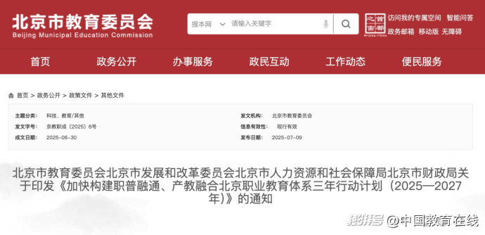 7月9日,北京市教育委员会网站发布《加快构建职普融通、产教融合北京职业教育体系三年行动计划(2025—2027年)》,其中明确提出:支持高水平高校与职业院校探索高职专科、职业本科、专业硕士贯通培养高水平技能人才。
