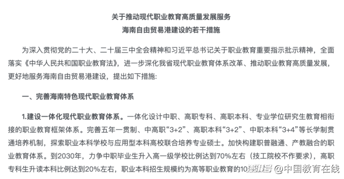 今年4月,海南省人民政府办公厅印发的《关于推动现代职业教育高质量发展服务海南自由贸易港建设的若干措施》中明确指出:建设一体化现代职业教育体系。一体化设计中职、高职专科、高职本科、专业学位研究生教育相衔接的职业教育框架体系。探索职业本科学校与应用型本科高校联合培养专业硕士。