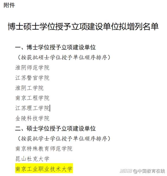 近日,江苏省教育厅发布《关于博士硕士学位授予立项建设单位拟增列名单的公示》。在这份公示中,格外引人瞩目的是包括1所本科层次职业学校——南京工业职业技术大学。