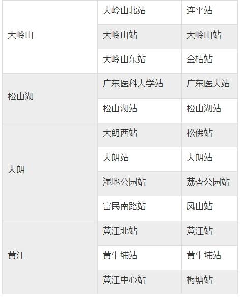 其中,1号线一期起于东莞西站(原工程名望洪站),终于梅塘站(原工程名黄江中心站),长57.99公里,途经望牛墩、洪梅、道滘、万江、南城、东城、大岭山、松山湖、大朗和黄江10个镇街(园区),实现中心城区与水乡片区、松山湖片区的快速联系。