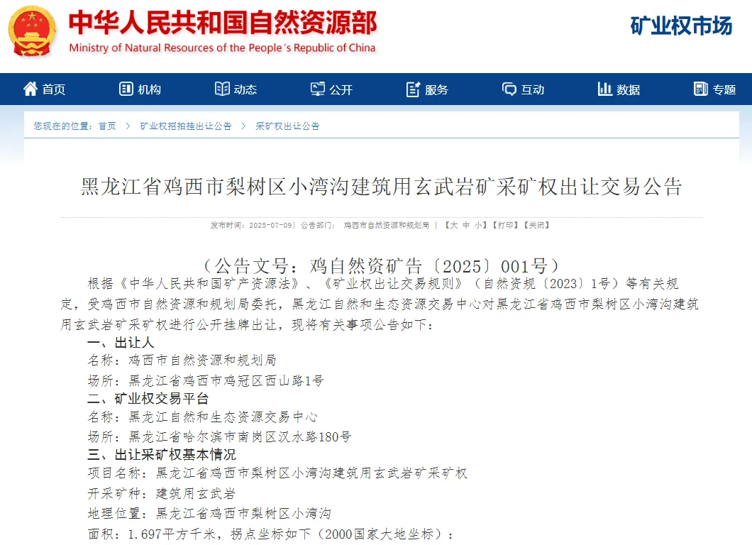 黑龙江省鸡西市梨树区小湾沟建筑用玄武岩矿采矿权出让交易公告