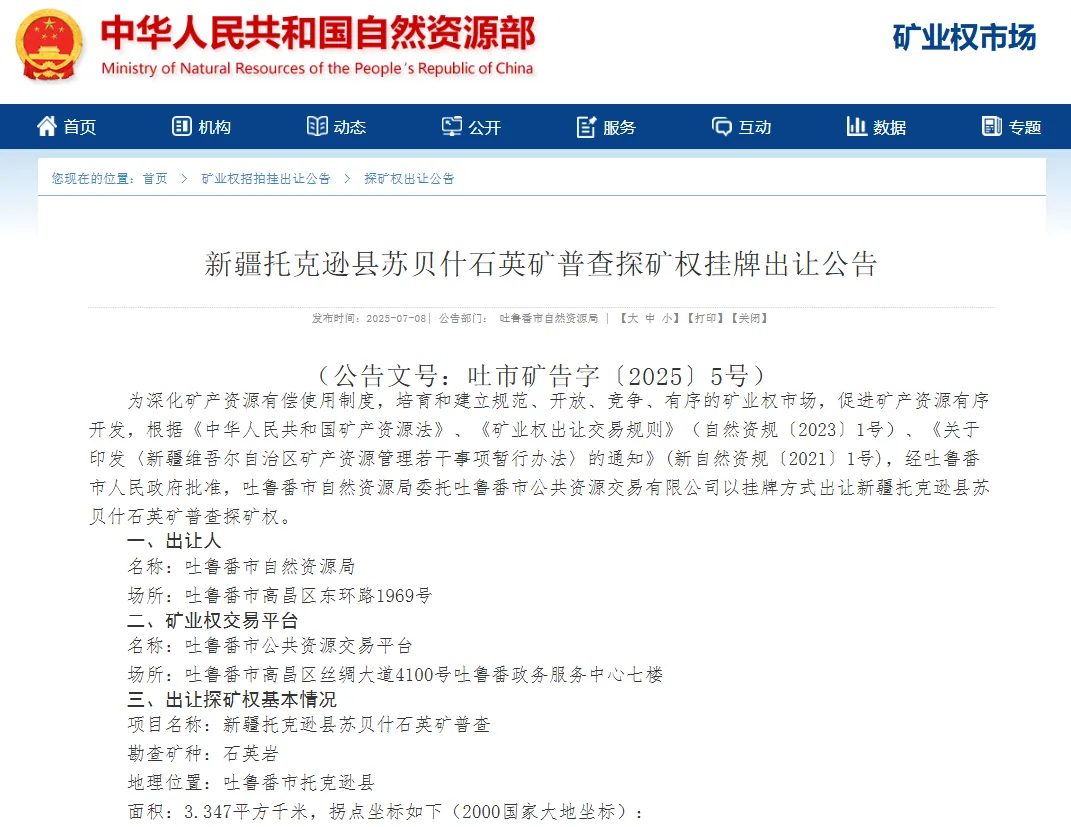 新疆托克逊县苏贝什石英矿普查探矿权挂牌出让公告