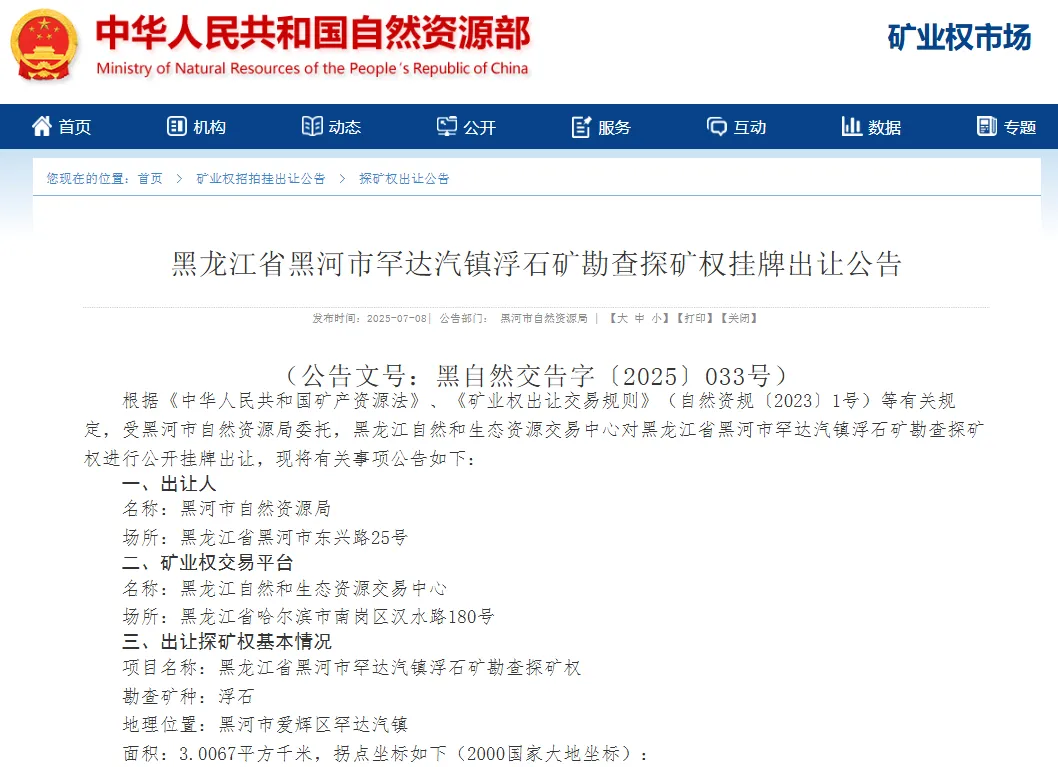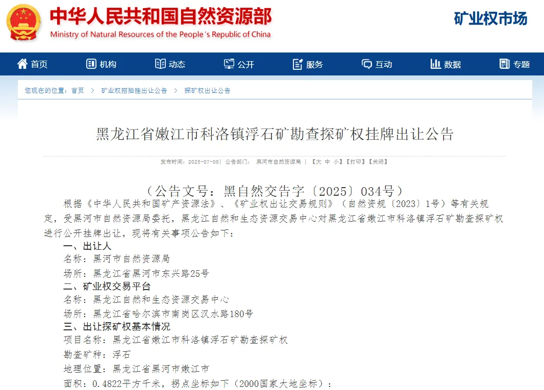 黑龙江省嫩江市科洛镇浮石矿勘查探矿权挂牌出让公告